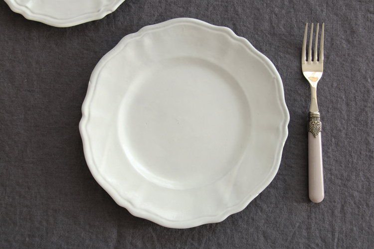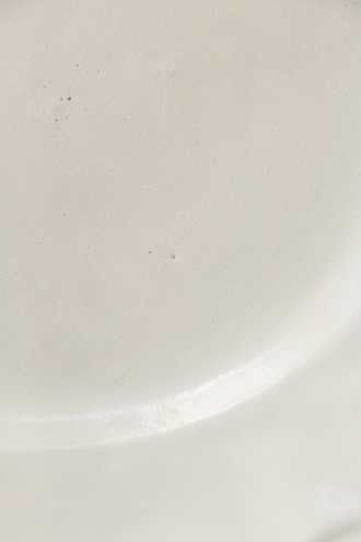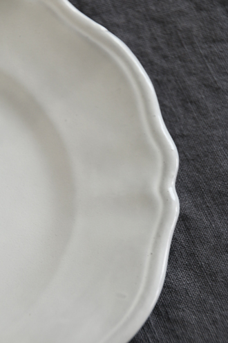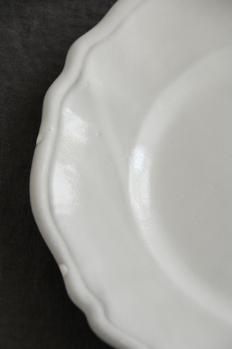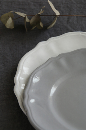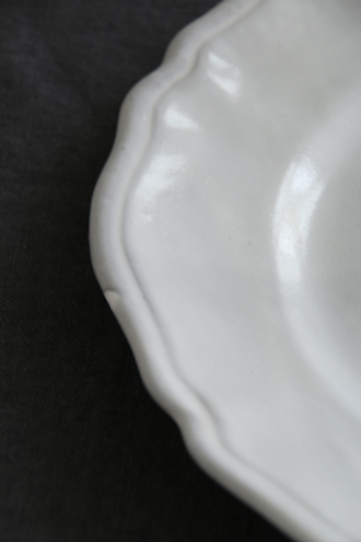 フリルのようなエッジのデザインは、シンプルさの中にも洗練された美しさが感じられます。粘土の色が透けて、少しグレーっぽいホワイトになっています。