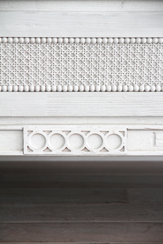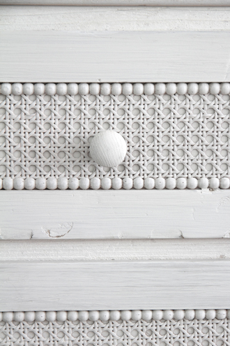 引出前面に施されたケーン張りと、ドットの装飾が美しいデザイン。引き出し部分はわずかにブルーグレーに塗られています。リサイクルウッドを使用しているので、塗装されていても木色が覗いていたり、ひび割れや打痕などが所々に見られます。